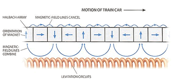 Linear synchronous motors replace the conducting plate with an array of magnets thereby reducing the need for such close tolerances and moving the magnets synchronously by locking onthe the magnetic wave. Recent advances developed for atomic accelerators where the magnetic force is doubled on one side of the magnet and cancelled out on the other, known as the Halbach array, have been utilized in some advanced linear motor systems substantially increasing the motors efficiency and levitating power. Add to this the latest discoveries in permanent Neodymium magnets and the most effective and most powerful system can now be economically developed.
